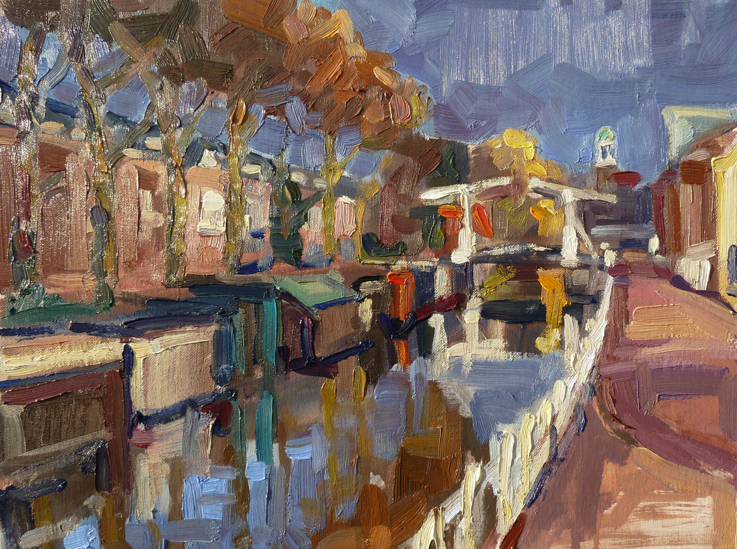'Leidsekade Live' plein air geschilderd begin van de lente aan het eind van de dag met prachtig licht en donkere lucht op komst.