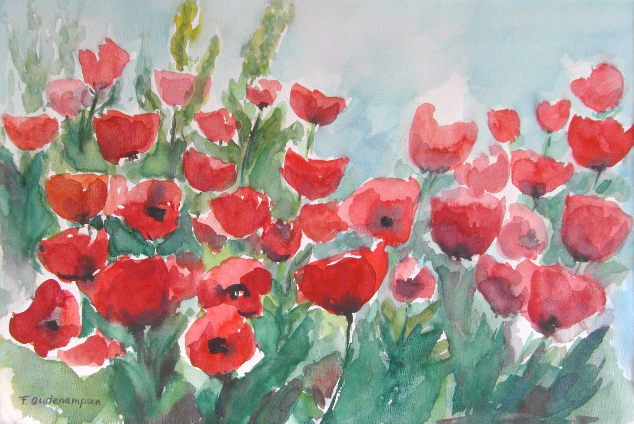 Klaprozen zijn kwetsbare bloemen. Met elkaar zijn ze sterk. De klaprozen zijn met vlakken geschilderd. Ze staan in een groen open veld.