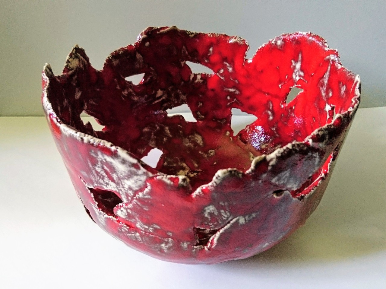 Schaal met rode galazuur. De schaal is opgebouwd in gescheuerde klei, Er zijn 'gaten' in de klei gelaten. De glazuur is niet egaal maar donker en licht rood en creme.