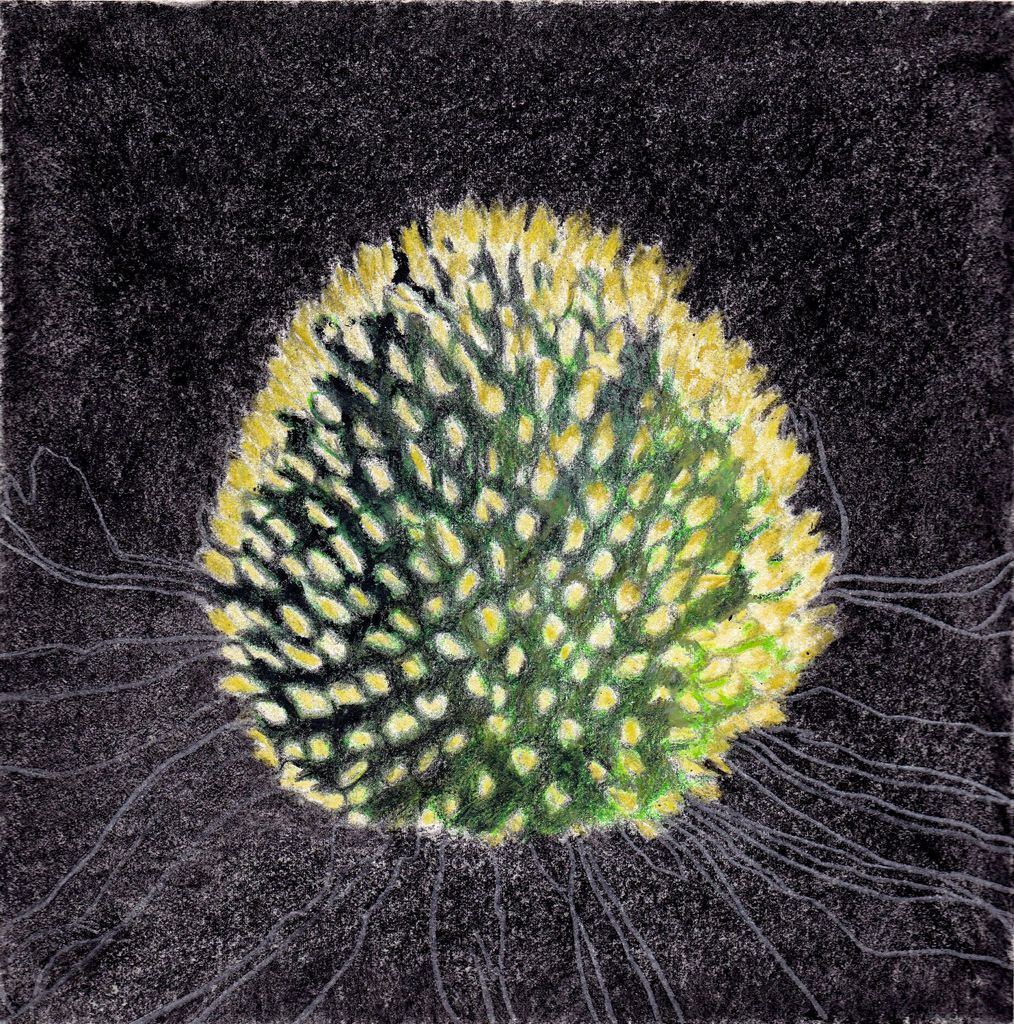 Wit Geel Zwart Groen Krijt Tekening Bloem Houtskool Aquarelpotlood Echinacea