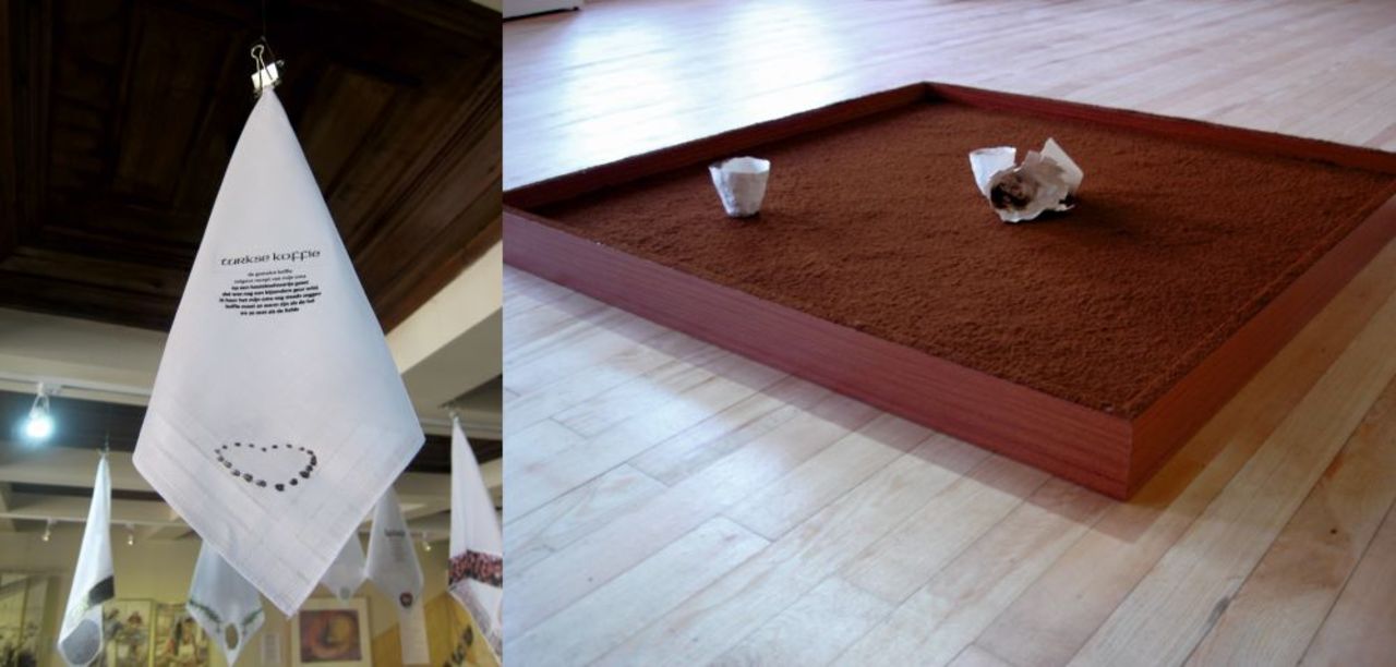 De Geurherinneringen #4 Installatie Turkse Koffie & Droste Cacao & Installatie De Geur van Herinnering - tekst/citaat op textiel Uitwisselingsexpo nederlandse - turkse kunstenaars in Eskişehir Kent Belleği Müzesi/ stadsmuseum Eskişehir (Turkije)