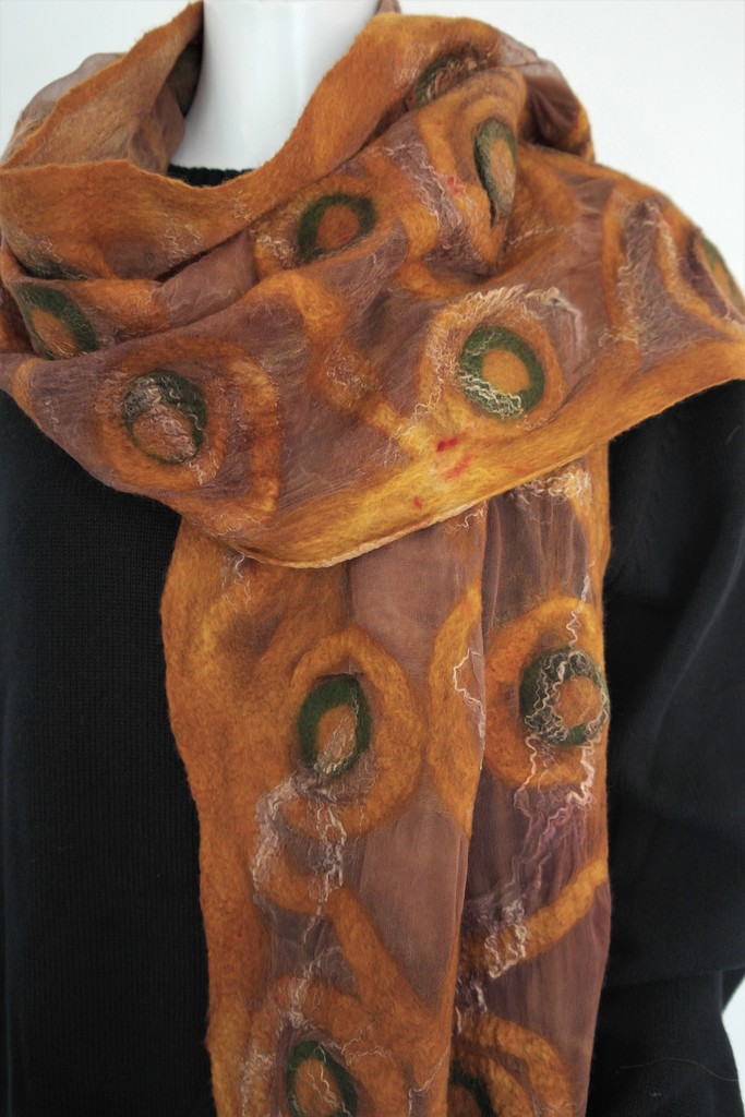Nuno felt sjaal in een spiraalmotief. Zijden chiffon bewerkt met wollen vezels. [19,5 micron] Kastanjebruine sjaal van zijde en vilt nunofelt voor dames. | Etsy