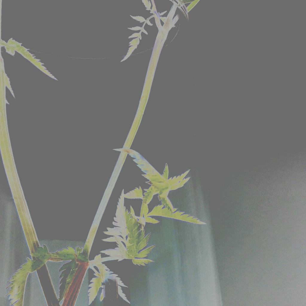 Vaas met bloemstengel, zodanig afgesneden dat er een vervreemding ontstaat ook door de digitale bewerking het in negatief zetten en aanpassing van de kleuren. Er is een foto met een zachte uitstraling ontstaan. Ik vind de kleuren erg mooi bij het onderwerp passen. Deze foto is klein van formaat in het vierkant maximaal 30/30. Een kleine foto kan met een groot passepartout heel mooi uitkomen. De focus komt dan op de foto te liggen.