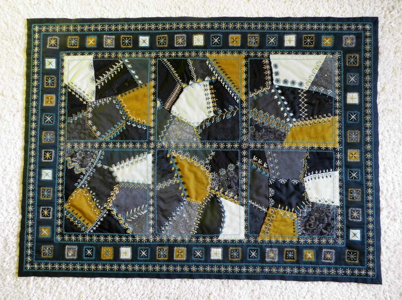 Modern Geel Zwart Blauw Groen Textiel Crazy Patchwork Borduren Kralen Wandkleed Quilt Crazyquilt Borduurwerk