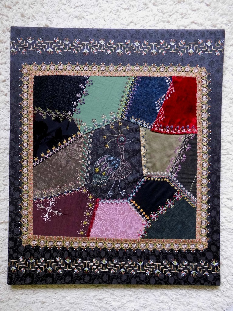 Met veel plezier ontwerp en maak ik mijn crazy quilts, een vorm van patchwork met onregelmatige vormen waarbij de naden bewerkt worden met borduurwerk, eventueel aangevuld met bijvoorbeeld kant, kralen of applicaties.