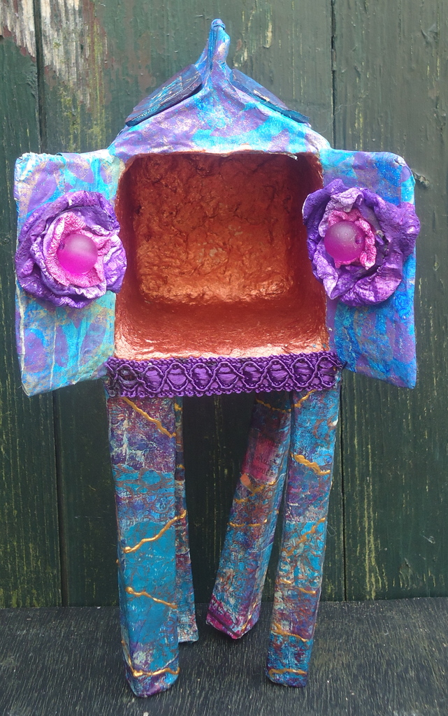 Deze "huisjes" of kleine etalages zijn gemaakt van melkpakken en papier-maché. Ze zijn bedoeld om iets in te leggen dat je dierbaar is. B.v. een sieraad of een foto.