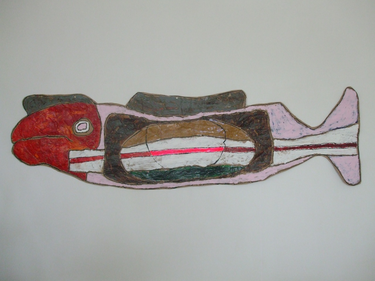 Vis met acrylverf / collagetechnieken op bewerkt pakpapier. De vis is bedoeld om in de ruimte te hangen. Hij is aan beide zijden te bezichtigen.