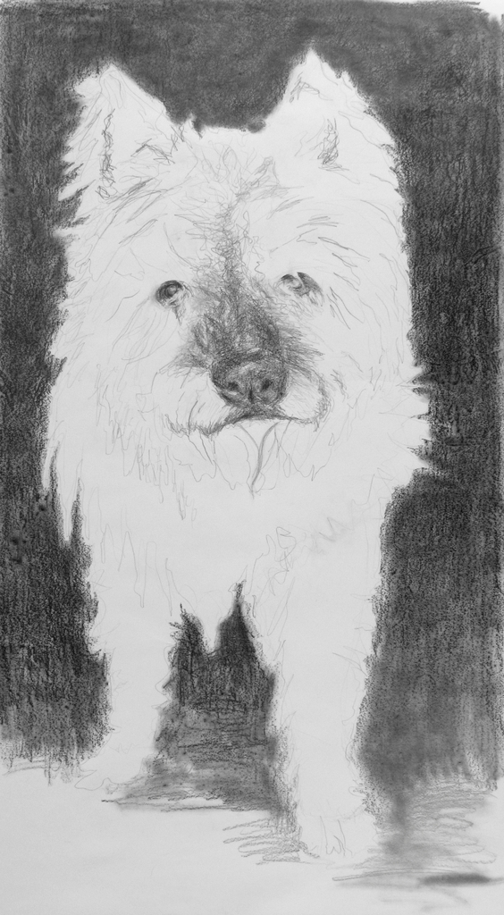 Sjaak, de 16,5 jaar oude ruwharige Hollandse herder, eens zwart (zie eerder schilderij) nu bijna wit. 4 x vergroot.