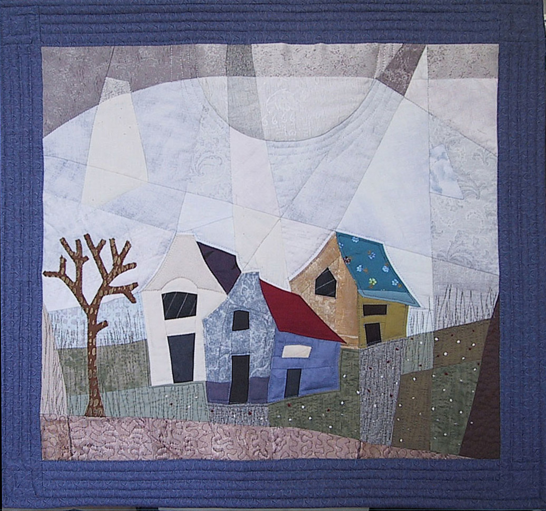 Drie huizen in landschap met boom. De lucht is verdeeld in geometrische vormen. Met borduurwerk en stiksels.