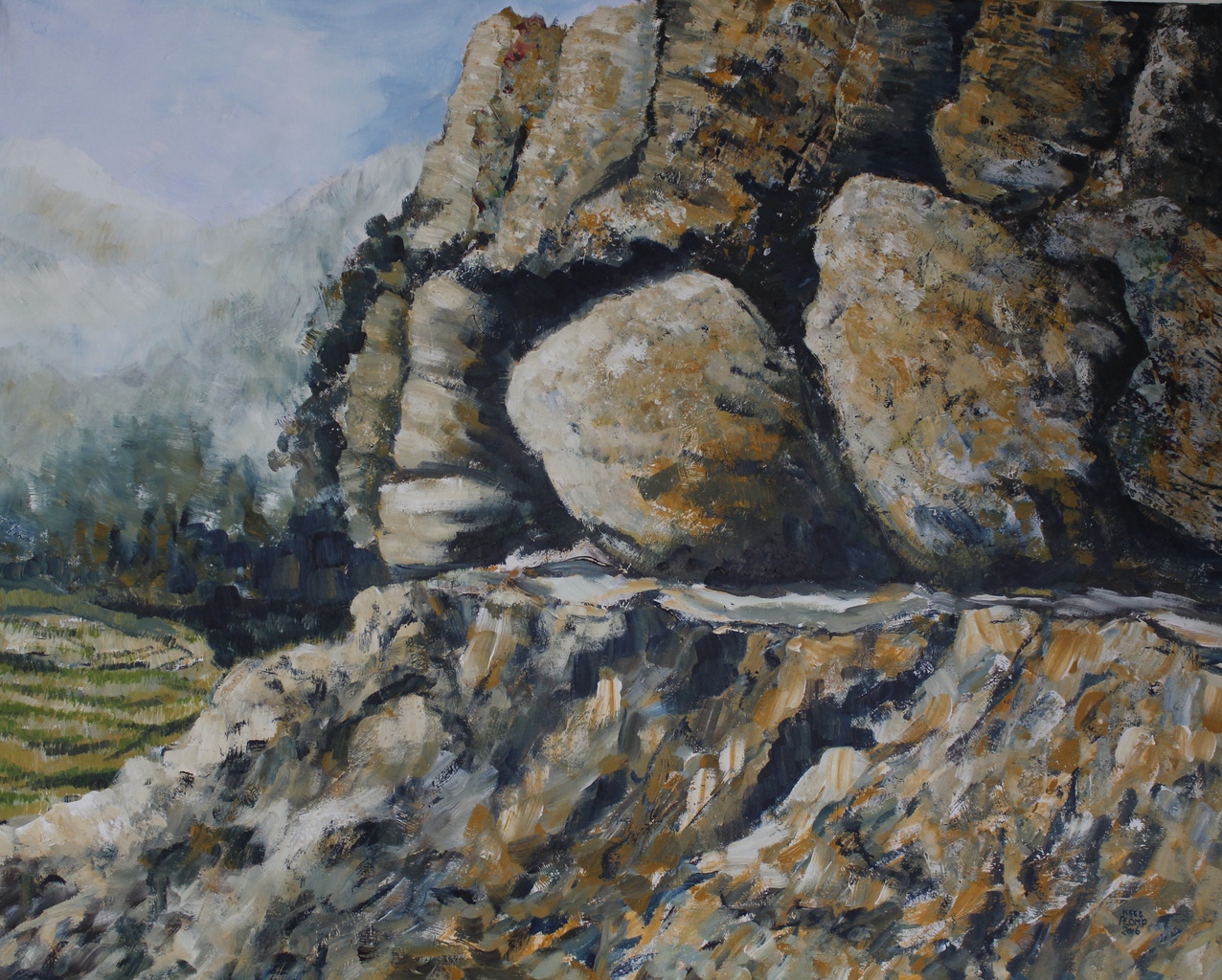 schilderij, acrylverf, pad langs een berghelling in Nepal.