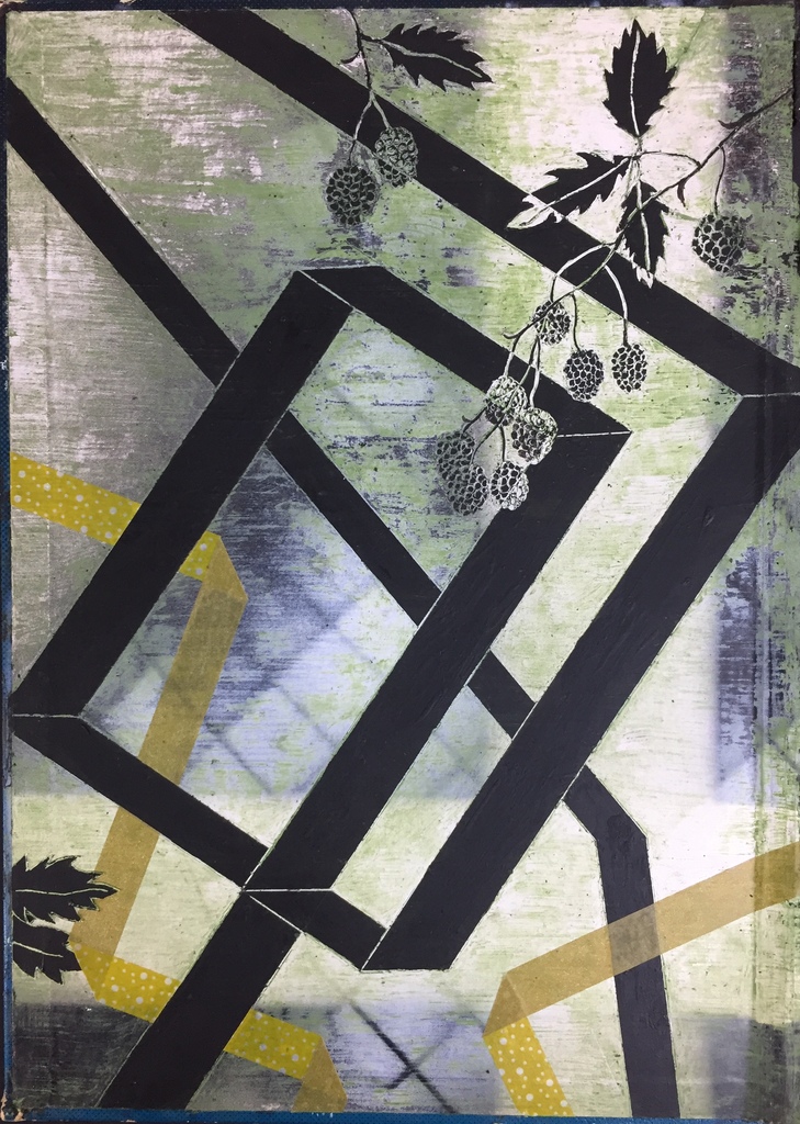 BOEKOMSLAG, oliepastel, spuitverf, lijnen, botanisch, tape