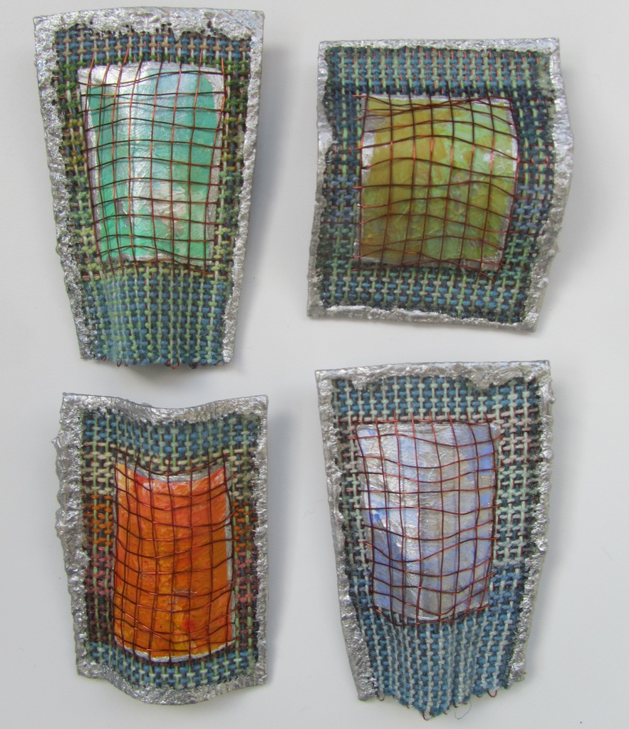 broches met koperdraad en cottolin en miniatuur met acrylverf
