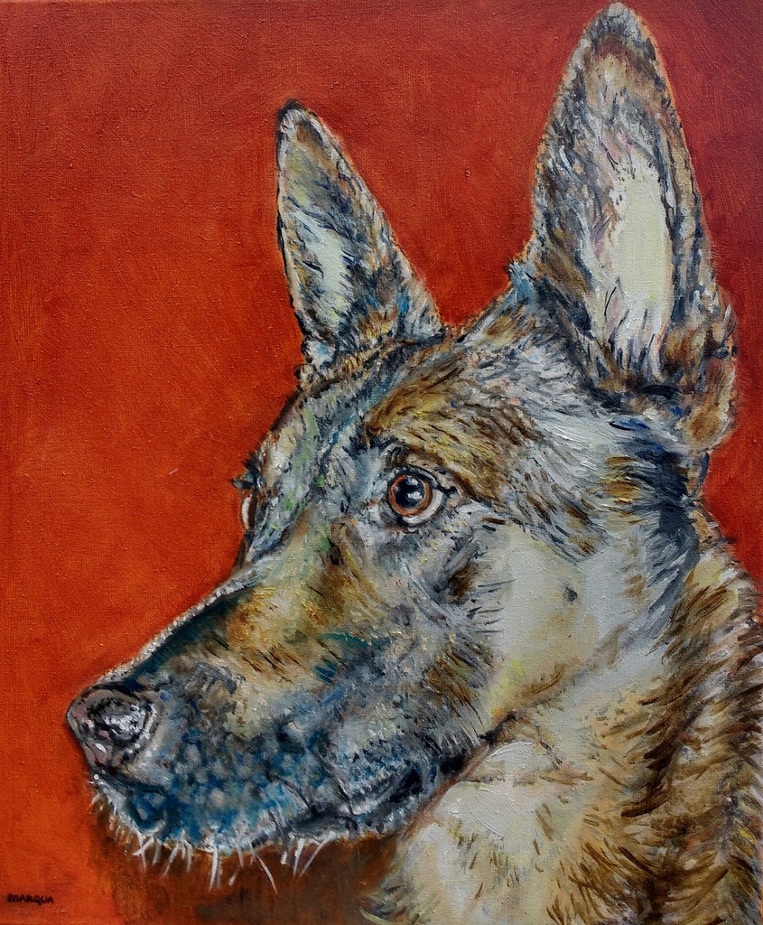 Hond, Mechelse herder in opdracht geschilderd in olieverf op linnen doek 50x60 cm.