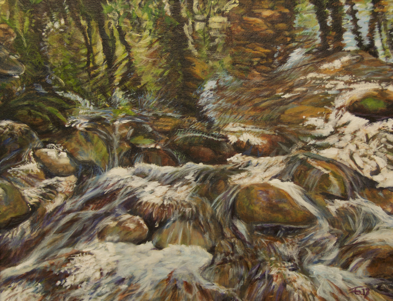 Het kabbelende water van deze potugese rivier leek me een uitdaging om weer te geven in verf. Inderdaad een hele klus met veel glaceerlagen, maar volgens mij goed gelukt.