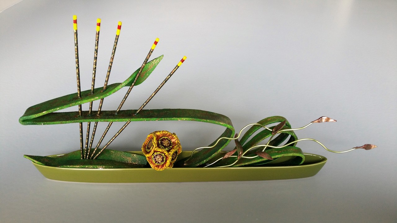Ikebana met Gerbera , pvc klei , foam, hout, aluminium draad, mixed media