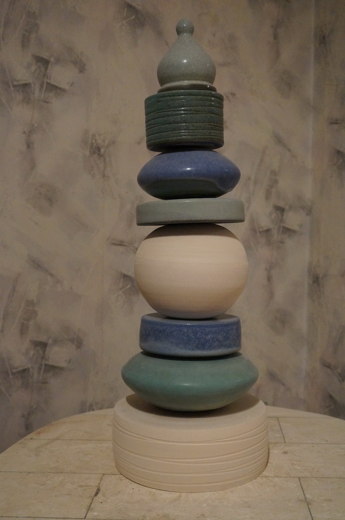 Losse schakels die één geheel vormen. Gedraaid met witte klei, voornamelijk blauw en groen mat glazuur.