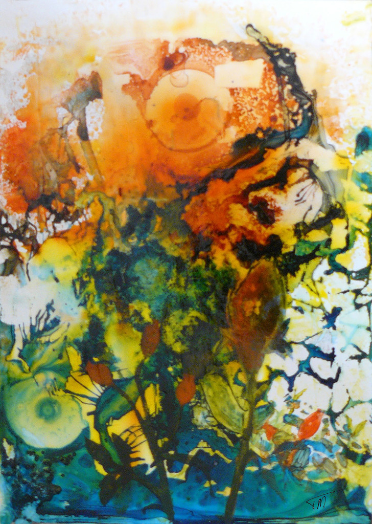 Het stelt een landschap voor met takken, struiken en fantasiebloemen. Het heeft te maken met een verhaal wat ik schreef over iemand die last heeft van een 'heftige'droom. Het is met alcoholinkt gemaakt.