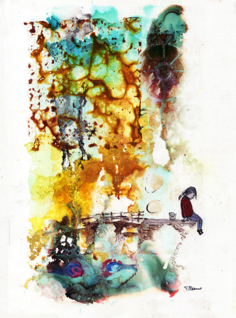 Een meisje zit op een wankele steiger en zoekt onder zich waar haar schepje gevallen is. Het heeft te maken met een verhaal wat ik schreef over iemand die last heeft van een 'heftige'droom. Het is met alcoholinkt en acryl gemaakt.