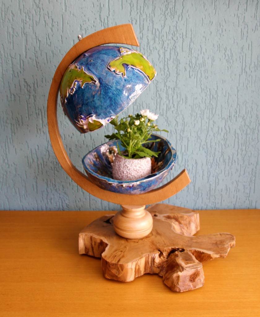 Open Aardbol waarvan de teakhouten houder op olijfhout is gefixeerd, waarin je bvb een vetplantje in kunt planten...