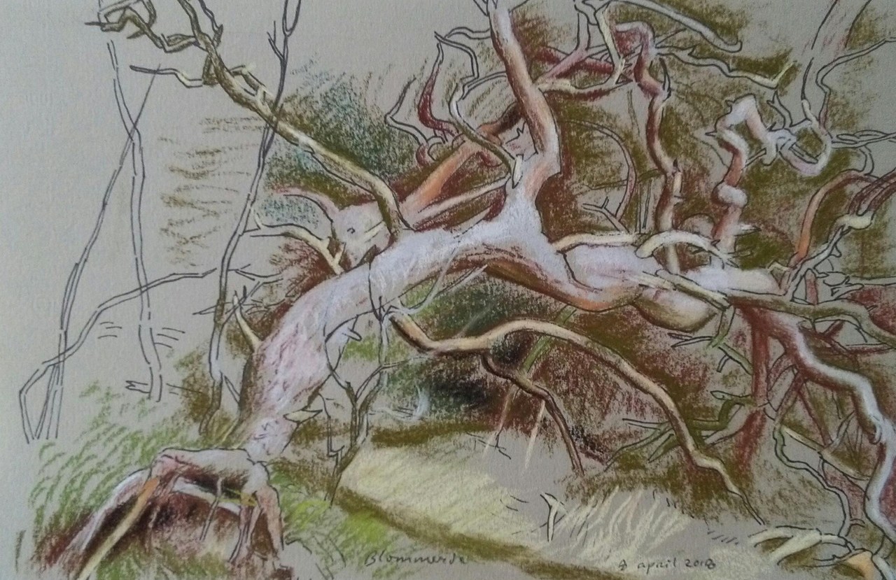 Pasteltekening van gebogen dennenboom, Meijendel, Den Haag