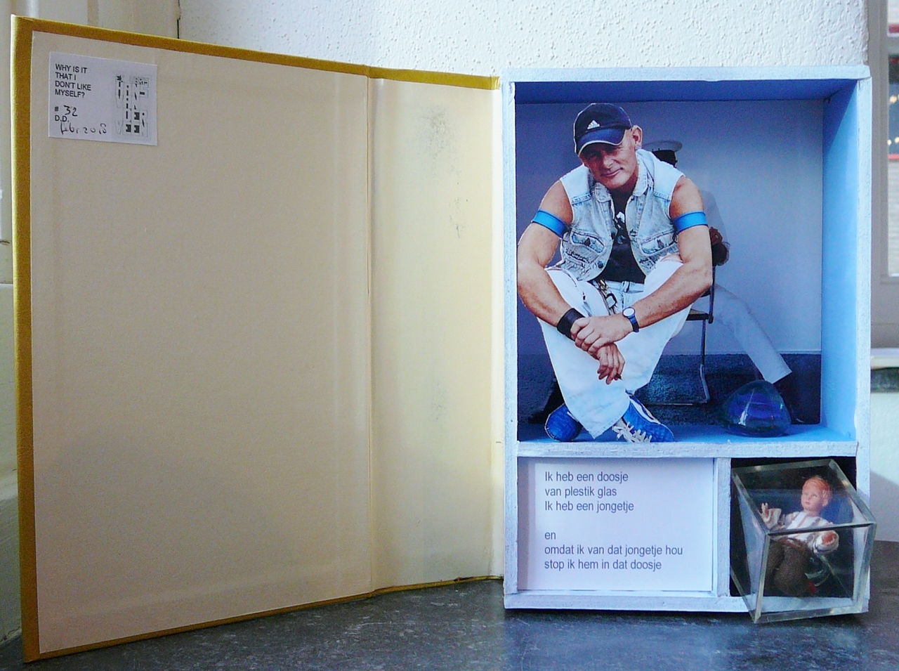 Boekdoos met daarin tekst en collage. 3D door ruimtelijke lagen achter elkaar.