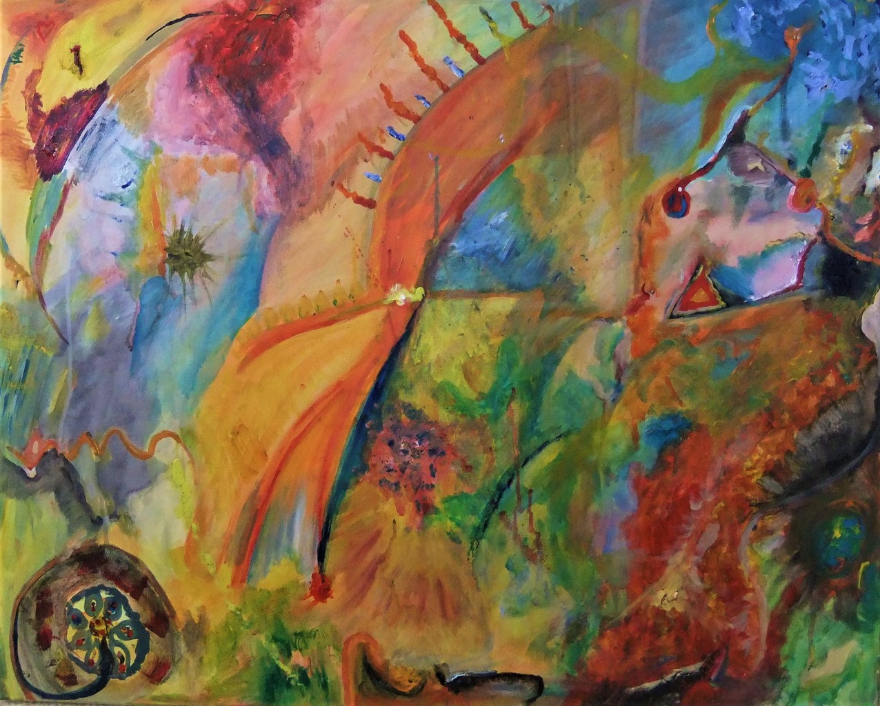 Dit is nog een doek uit het begin, ik wilde toen blijkbaar veel vertellen en laten zien. Doek is daarom vol met veel afbeeldingen, kleuren, beweging. Links onder lijkt een doormidden gesneden granaatappel te zitten. Hernnering aan Datca in Turkije. In het rechtsmidden staat een tentje, denk ik. Vandaar de naam van het schilderij. Er was verder geen reden of aanleiding voor dit schilderij, behalve misschien dat de beelden die er onwillekeurig op zijn gekomen en die verstopt in mij zaten,er toch een keer uit wilden