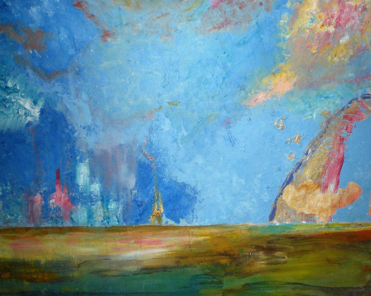 Iemand zg hier een in zee stortende roze walvis in. Meer kan ik hier niet over vertellen. Schilderij zelf vertelt zijn eigen verhaal.