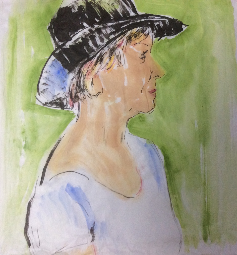 Vrouw met hoed in aqurel en inkt.