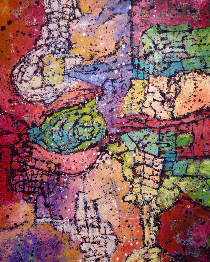 Abstracte schilderijen en dito beschilderde objecten in een stijl die ligt tussen geraffineerde eenvoud en georganiseerde chaos