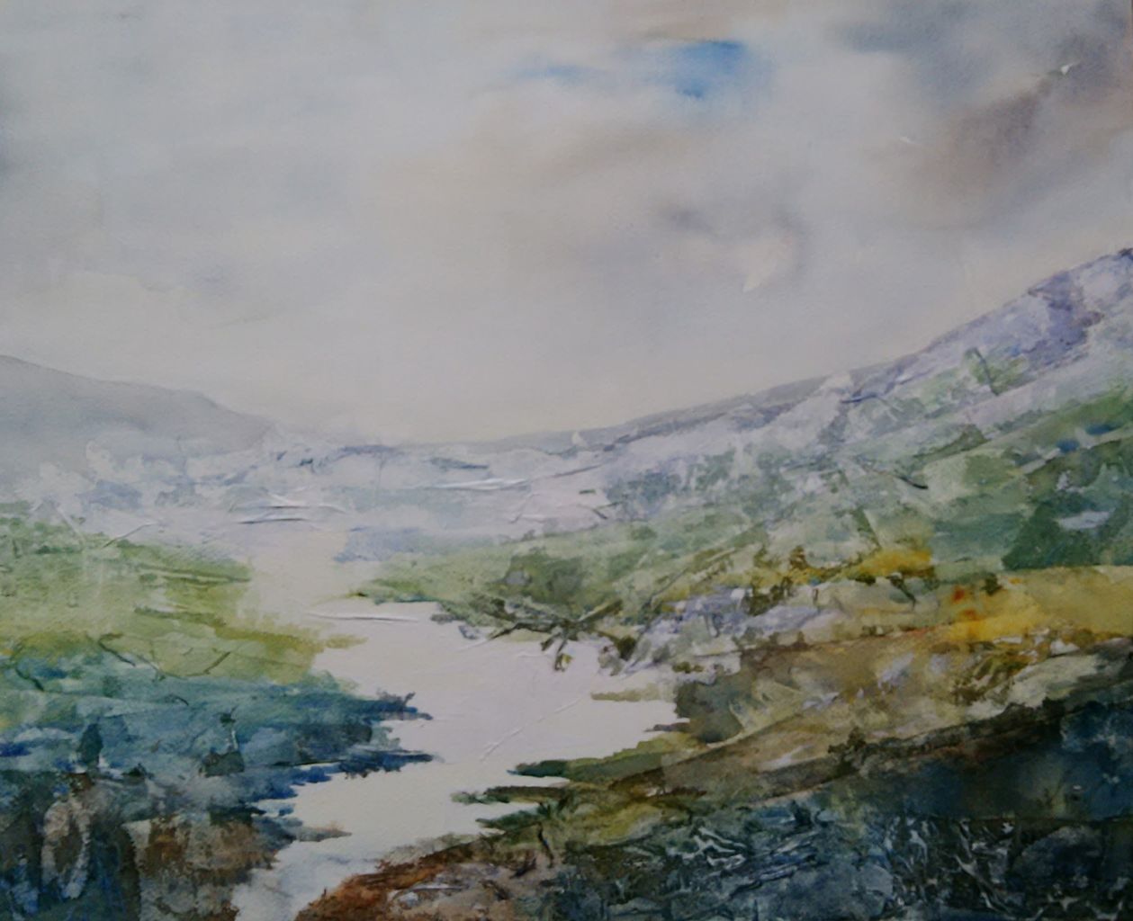 Landschap 1, aquarel en collage 60 x70 cm