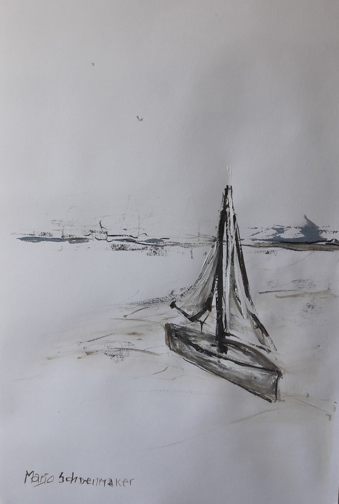 Zeilboot op weg...... Acryl en houtskool op papier