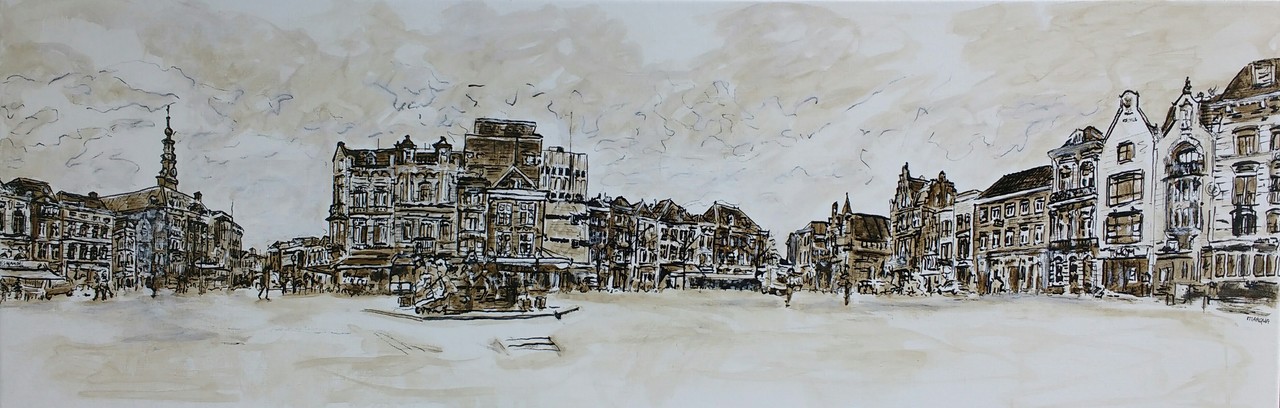 Skyline van de Bossche markt. Getekend en geschilderd met een ganzenveer en penselen op een linnen doek 40x120 cm. Oost-Indische en sepia inkt en witte acrylverf.