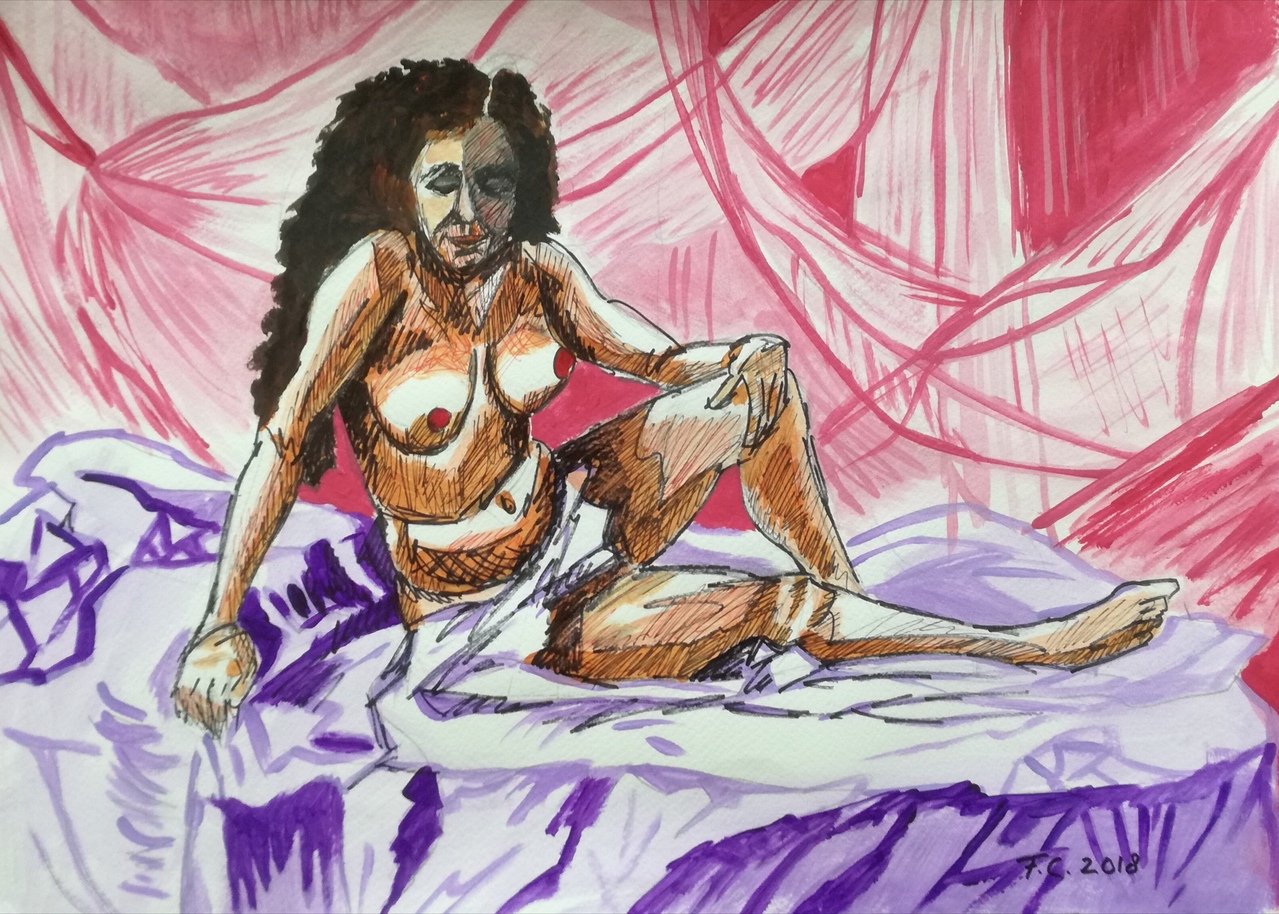 Vrouwen Paars Portret Naakt Potlood Model Acrylverf Roze Bed Twijfel Ondeugend Stift Ongekleed Erotisch Pittig Beslissing Pikant