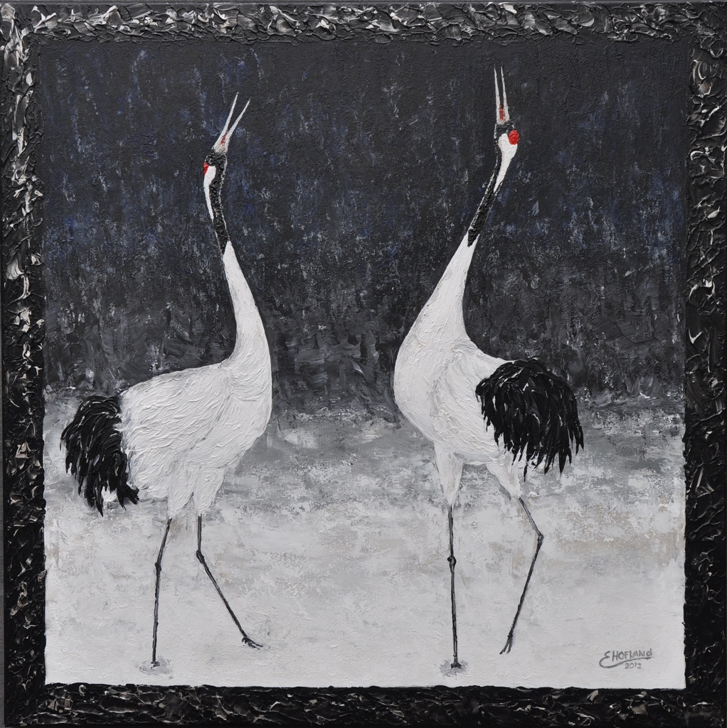 Kraanvogels in rituele dans - acryl op doek met aangeschilderde rand