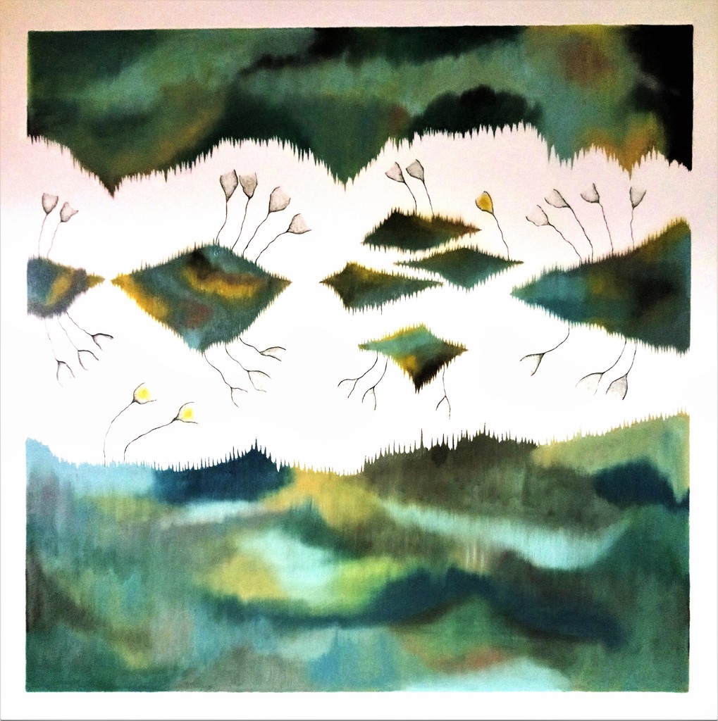 Compositie in groen. Landschapachtig beeld met organische vormen