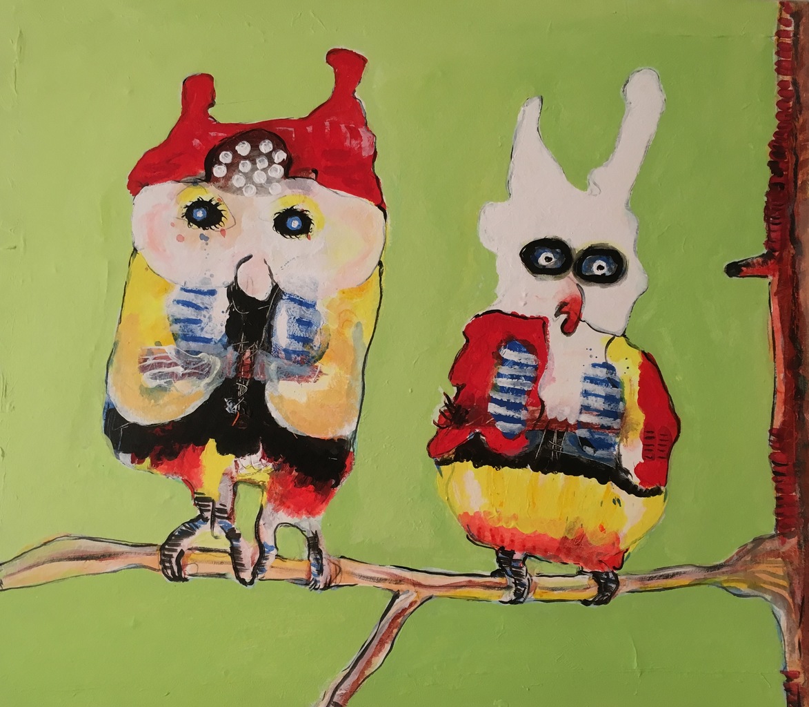 Overgeschilderd schilderij met vogels op tak !