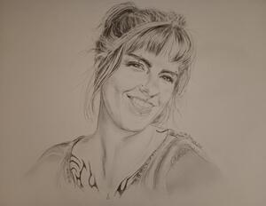 Yvonne (1970), Den Bosch, tekent portretten van foto. Zwart-wit, aquarelpotlood, realistisch of met extra.
