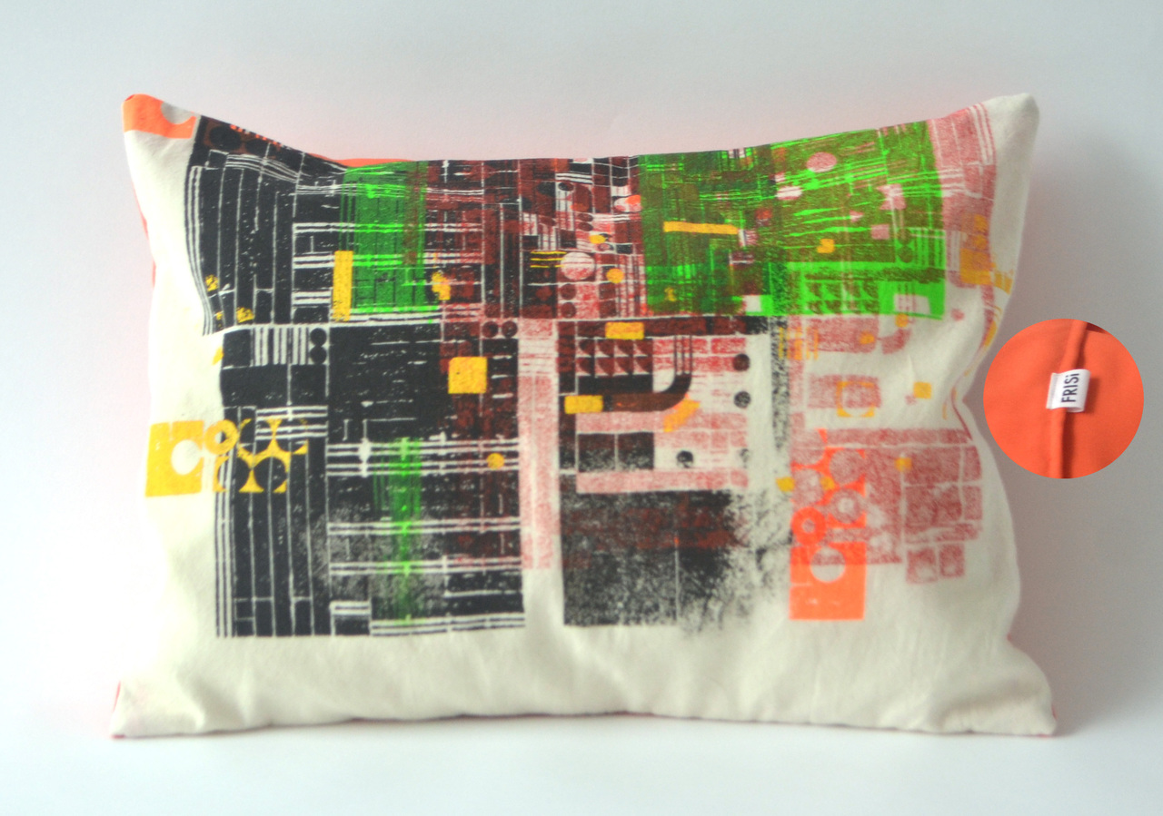 Lego druk. Achterkant van het kussen is effen oranje met envelop sluiting. Kussen hoes kan gewassen worden op 30 graden.