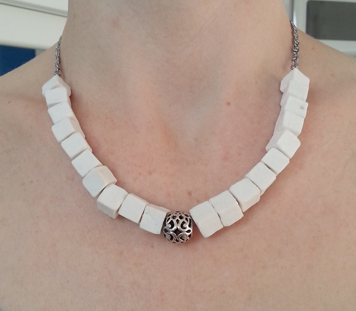 ketting met witte blokjes van porselein met in het midden een opengewerkte zilveren kraal