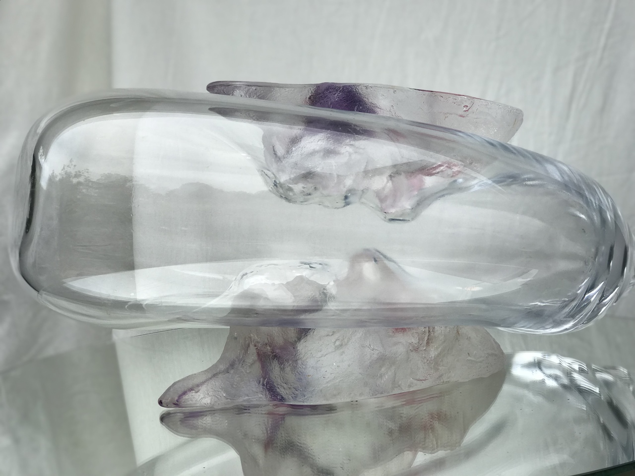 Twee portretten van vormgesmolten loodkristal met daartussen een geblazen bol, gepresenteerd op een spiegel voor extra dimensie.
