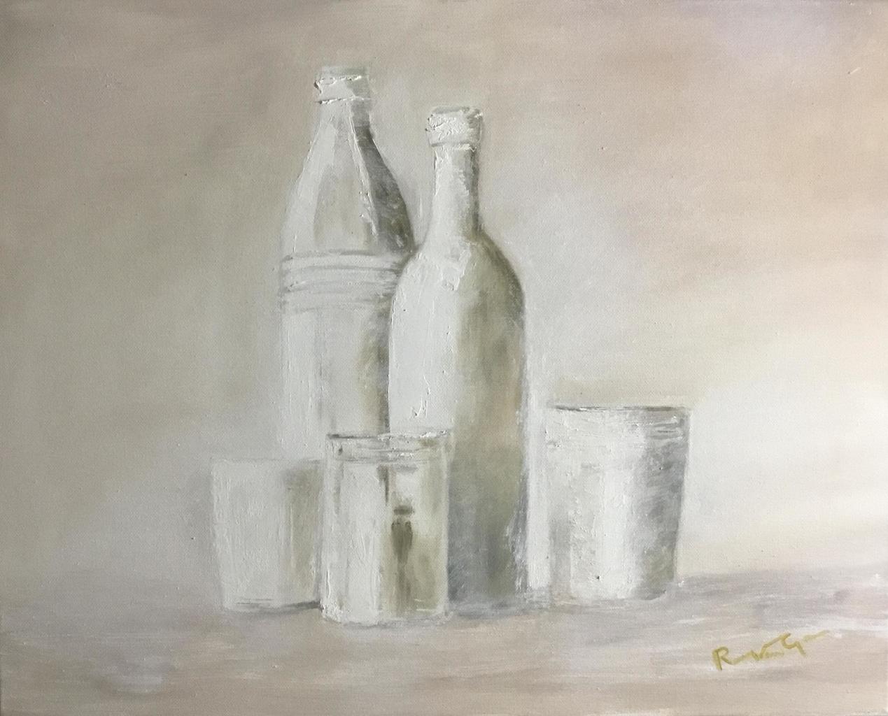 Stilleven met flessen in het wit.