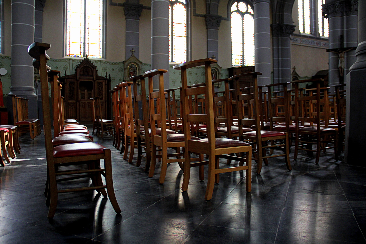 Het mooie interieur met oude bidstoeltjes van een dorpskerkje in Wallonië.