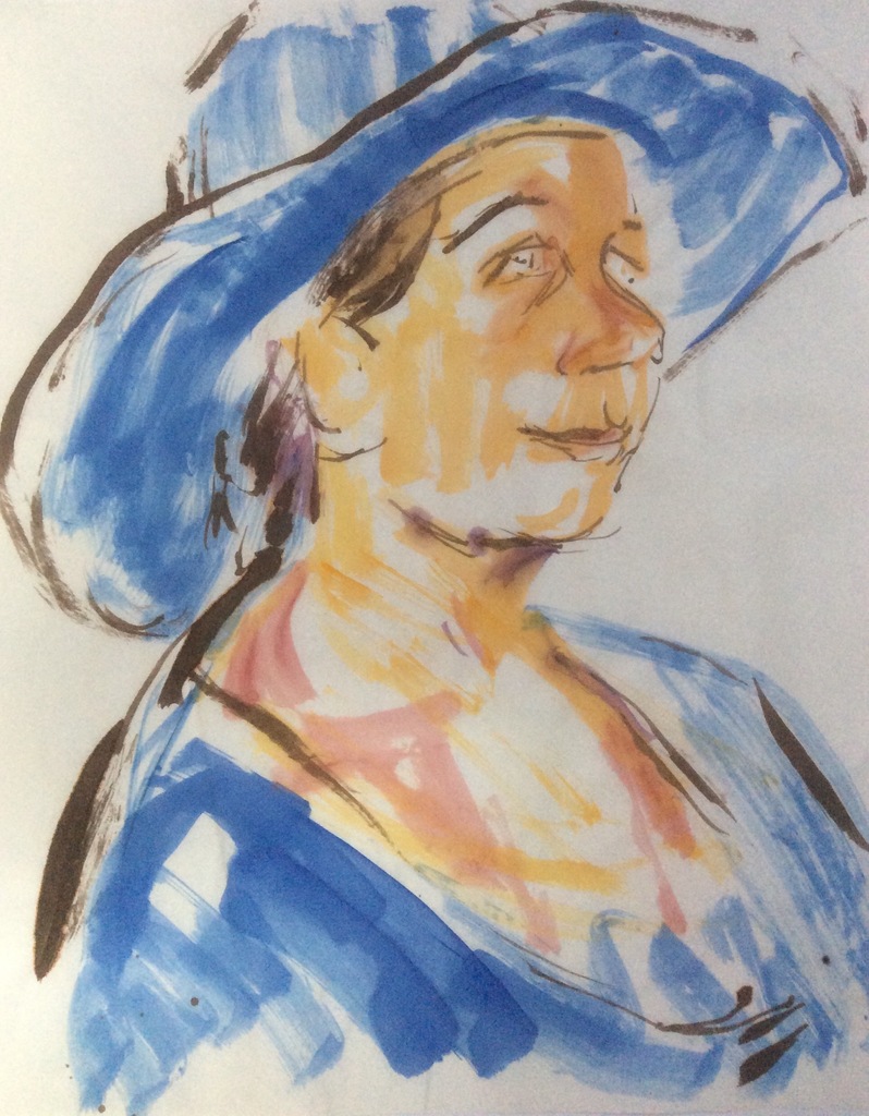 Vrouw met hoed in aquarel en inkt op Japans papier