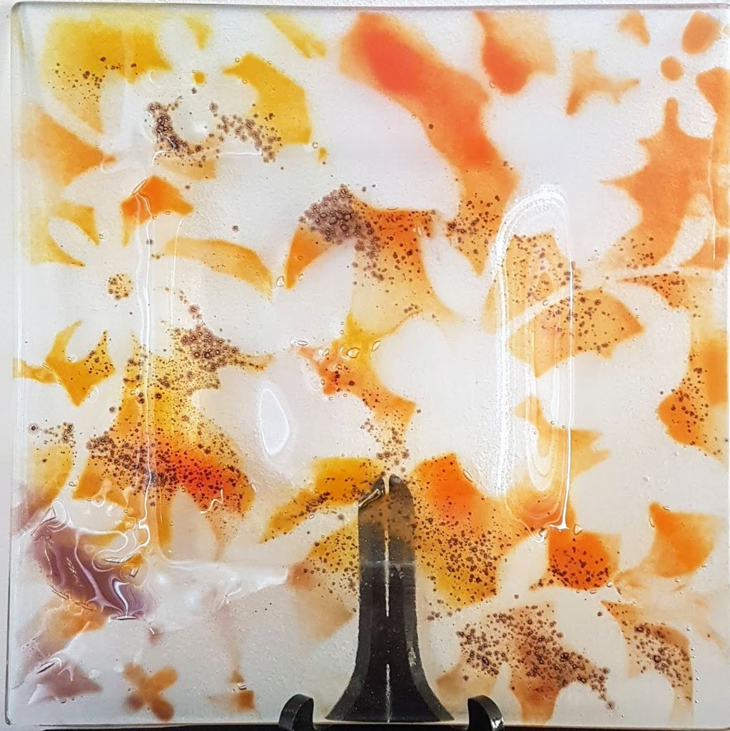 Schaal of onderbord van Spectrum glas, bewerkt met glaspoeder in herfstkleuren.