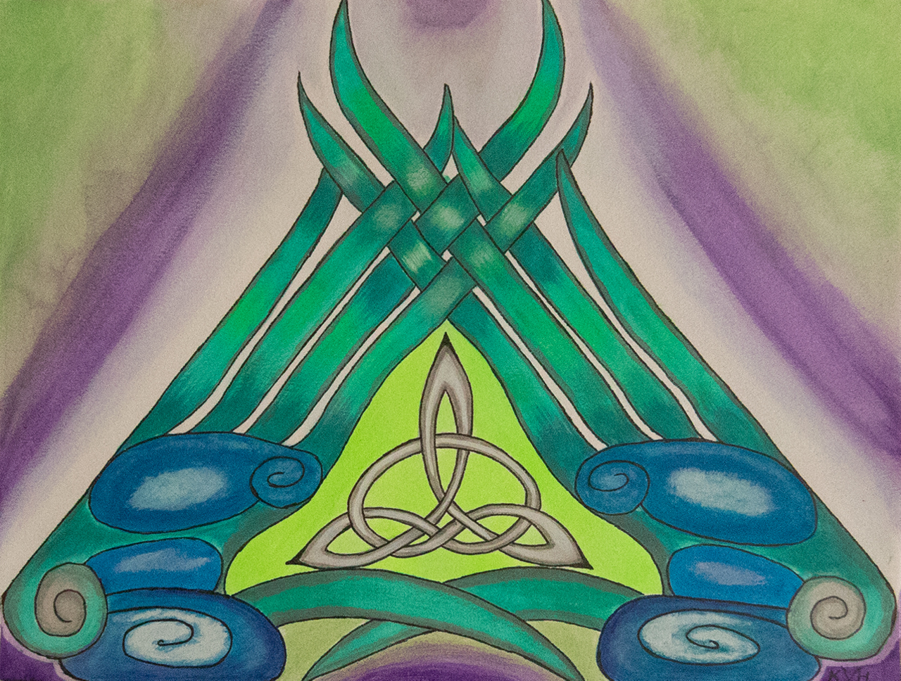 In het midden waar het vuur is, staat ook de Triquetra en het Lemniscaat als een verweven eenheid. De drie-eenheid, dat op velen manieren te interpreteren is, heeft zich verbonden met de eeuwigheid, waaraan de flow van het dagelijks leven, de seizoenen en alle cycli mee gemoeid gaan.