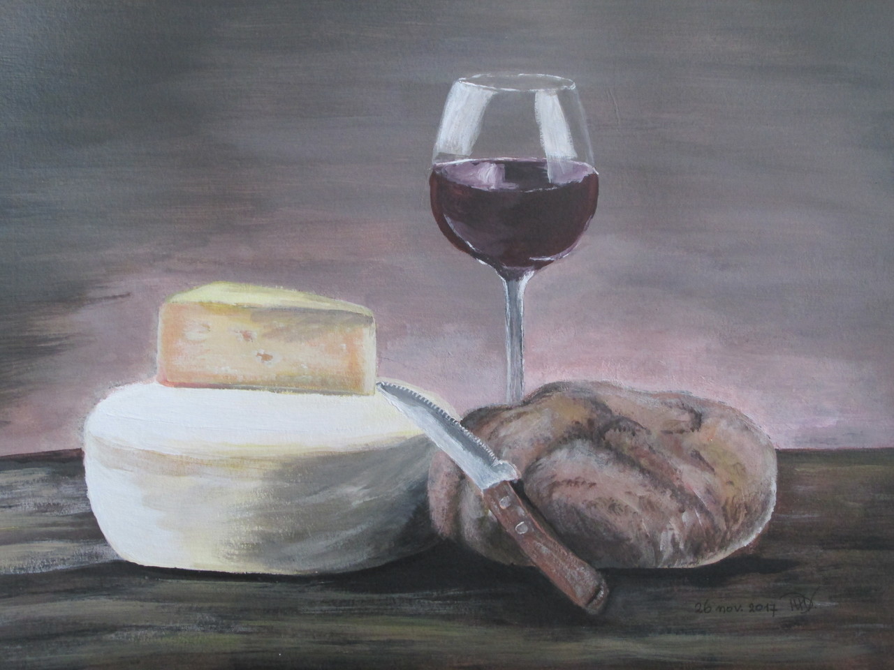 Stilleven met wijn,brood en kaas. Acryl op papier. Inclusief lijst met passe partout 42cm x 52cm.
