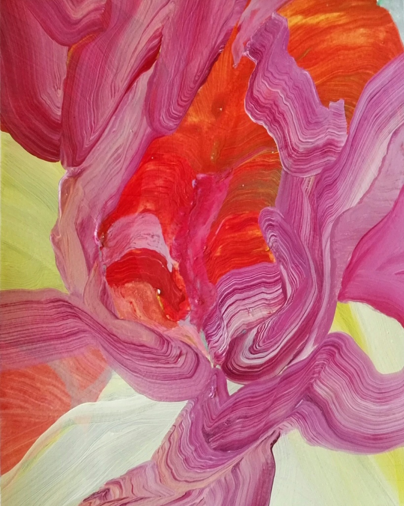 Het is mijn manier van kijken naar de dingen....De bewegingen die ik maak in de verf.... De beelden zijn sensueel en met een erotische associatie. Dit is niet voor iedereen waarneembaar. Mijn inspiratie vind ik in het binnenste van bloemen ( insideofaflower) , in schelpen en vruchten... Door in te zoomen op de kwaststreken van eerdere werken ontstaan er nieuwe beelden. Losse vormen die een eigen leven gaan leiden. Ze lijken heel vleselijk en lichamelijk. Ik houd zoveel van verf dat ik verzamelingen aanleg van losse kwaststreken en vlekken op een transparante ondergrond. Zo ben ik steeds op zoek naar vernieuwing in mijn werk. Naast tekenen en schilderen maak ik ook collages en kleine objecten. ZIE ook instagram : inekedimphiclaessens