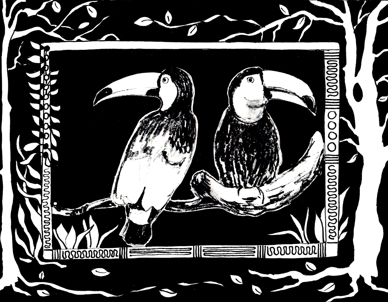 twee toekans geschetst in houtskool met een versiering in inkt als silhouet, ingelijst in aluminium lijst van 35 x 40 cm met gebroken wit passe-partout