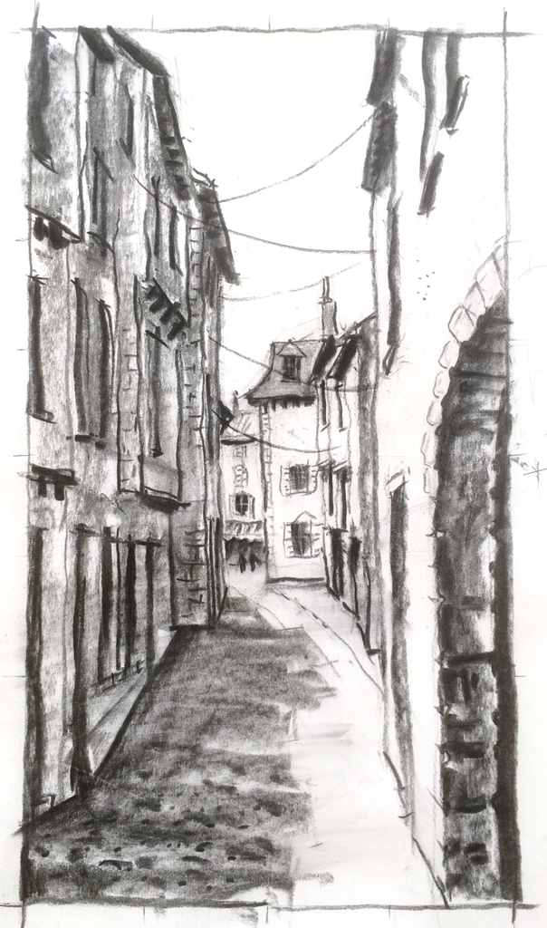 No. 1 in de serie houtskool-acryl-olieverf op papier: een straatje in Blesle in Auvergne (n.a.v. een schets uit 1985)