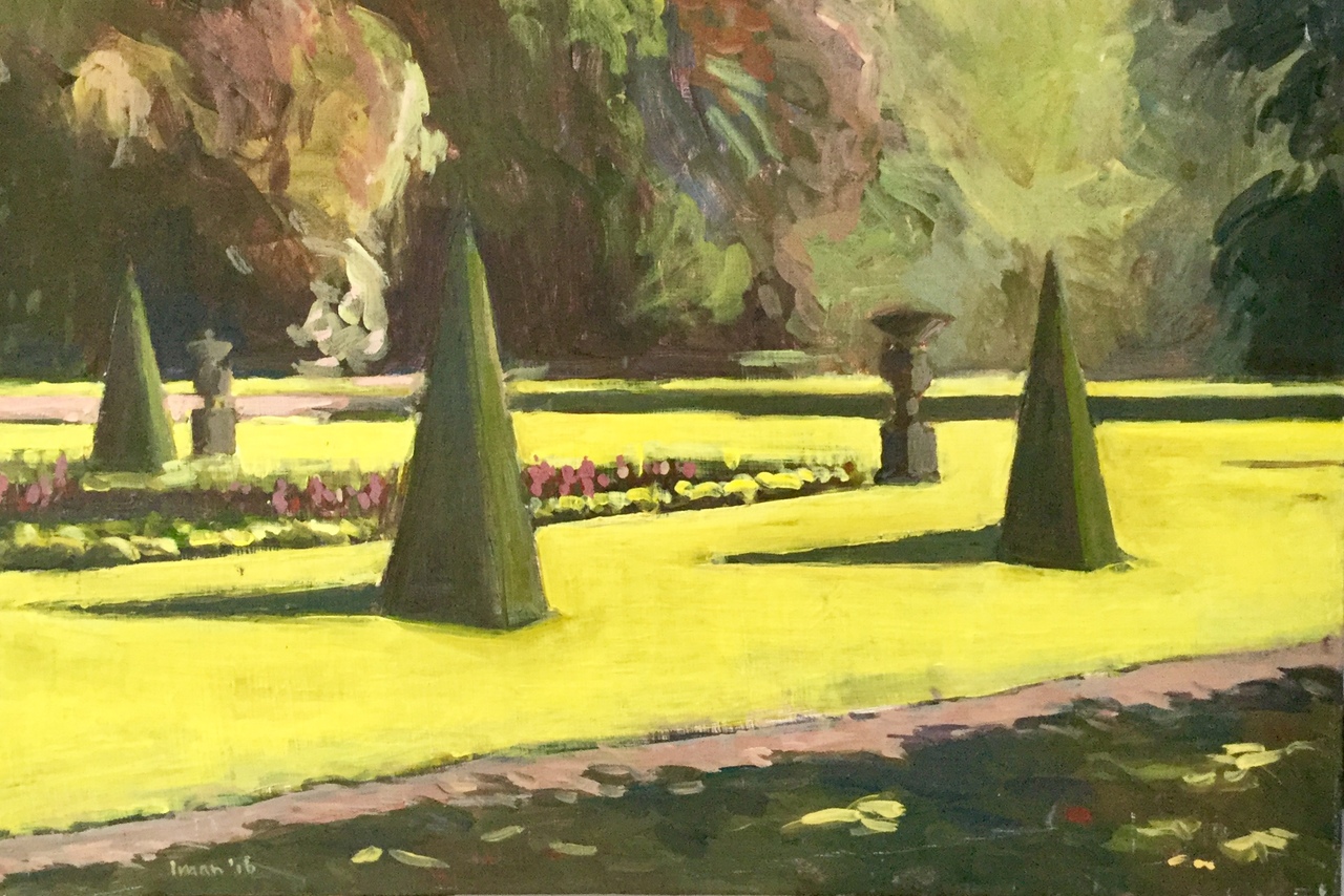Lange herfstschaduwen in Romeinse tuin van Kasteel De Haar, Haarzuilens.